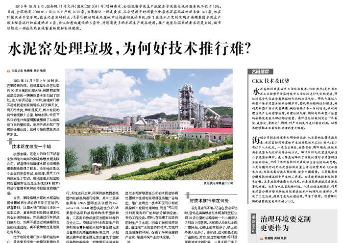 ????海創公司副總經理李大明告訴記者,從目前的運營實踐來看,水泥窯協同處置城市生活垃圾技術(CKK技術)至少有以下八大優點。一是自主研發、世界首創、國際領先;系統採用水泥窯與氣化爐相結合的方式,輸送垃圾氣化焚燒氣體進入水泥窯分解爐,最大限度地降低了垃圾處理對水泥窯煆燒系統的影響,開闢了水泥窯協同處置城市生活垃圾的新思路。二是與國內外利用水泥窯協同處置生活垃圾常用的RDF技術相比,垃圾無需分選及預處理,適合中國國情。三是能有效分解垃圾處理過程中產生的二惡英。四是能有效控制垃圾臭氣擴散。五是垃圾資源最大化利用。六是垃圾滲濾液及廢渣無害化處理。七是與水泥窯無縫對接。八是處理流程簡單,利用水泥窯分解爐替代傳統垃圾焚燒技術中的煙氣處理部分,簡化了工藝流程,提高了尾氣處理效果,節省了投資。投資額比同規模焚燒發電專案減少三分一。